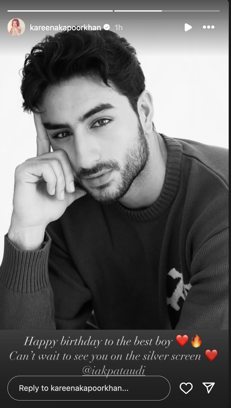 बुधवार 5 मार्च को करीना ने इंस्टाग्राम पर इब्राहिम की एक तस्वीर शेयर की जिसमें वह राउंड-नेक स्वेटर में कैमरे के सामने पोज दे रही हैं। तस्वीर के साथ उन्होंने लिखा, "सबसे बेस्ट बॉय को जन्मदिन की बधाई । सिल्वर स्क्रीन पर तुम्हें देखने का बेसब्री से इंतजार है ।" इब्राहिम ने अपनी इंस्टाग्राम पर स्टोरी को फिर से शेयर किया और लिखा, "थैंक यू के," इसके साथ ही कुछ आंसू भरी आंखों, रेड हार्ट और ताज वाले इमोजी भी इसपर शेयर किए।