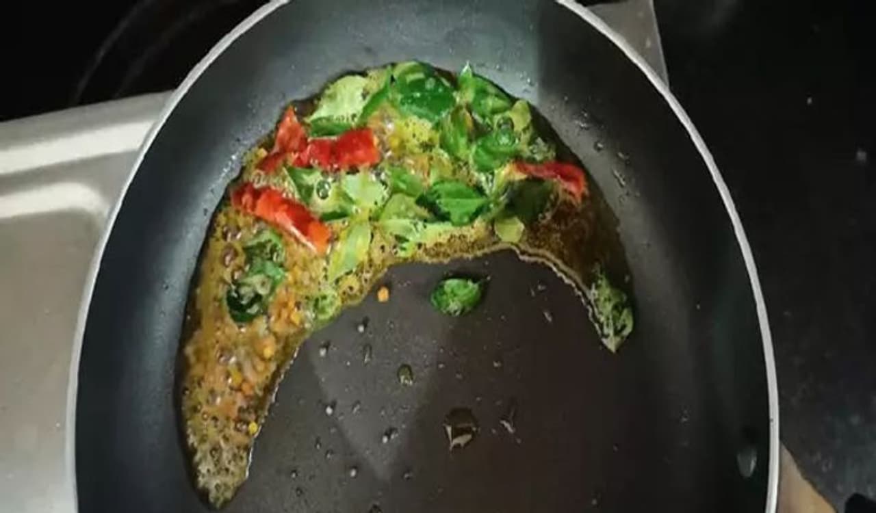 सबसे पहले बची हुई दाल से सांभर बनाएंगे। इसके लिए एक गैस पर कड़ाही चढ़ा दें। इसमें तेल डालें। जब तेल गर्म हो जाए तो उसमें राई डालें। इसके बाद इसमें कढ़ी पत्ता और लाल मिर्च डाल दें।