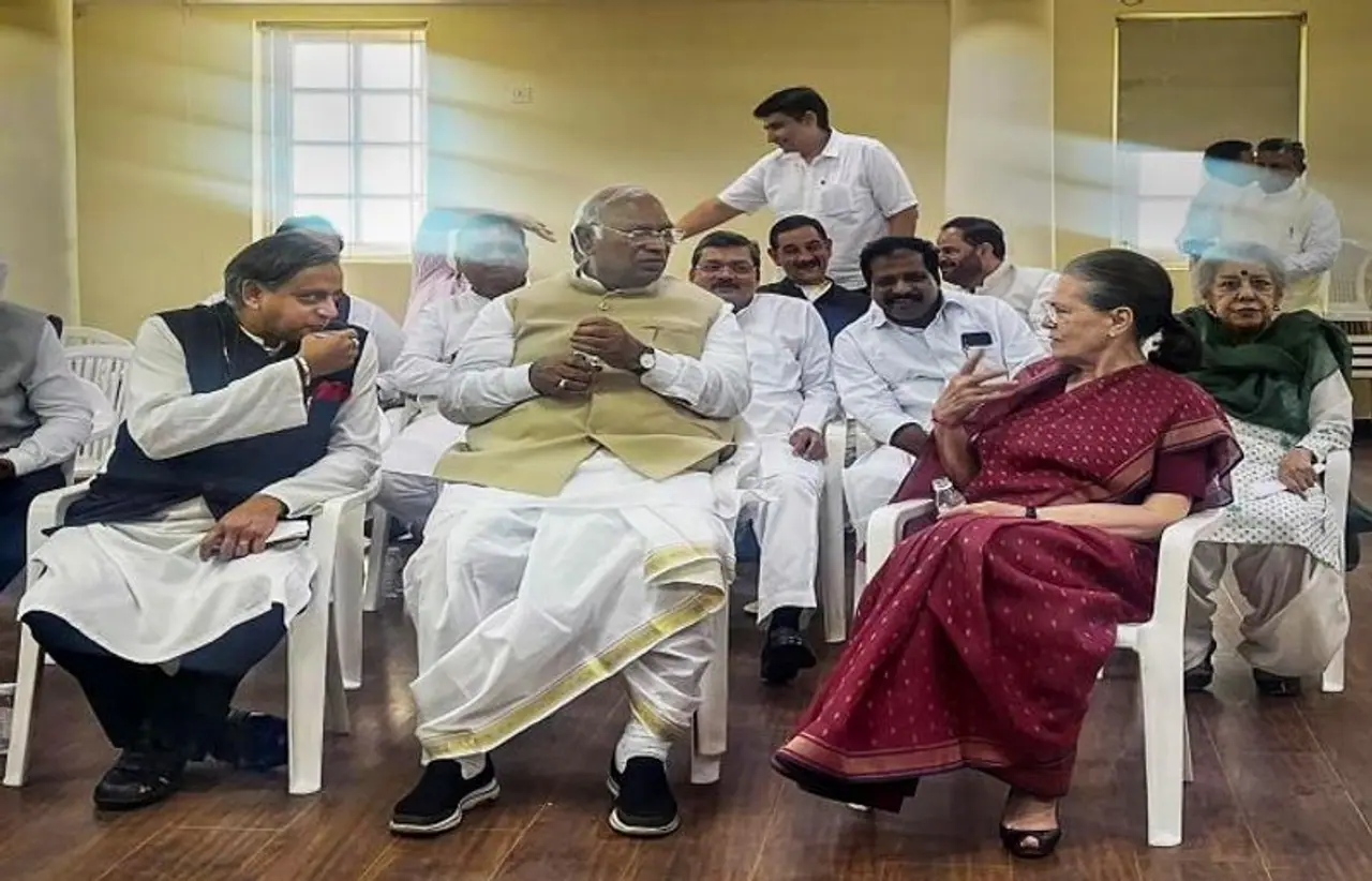 यह तस्वीर नई दिल्ली कांग्रेस कार्यालय की है, जहां मल्लिकार्जुन खड़गे पार्टी नेता सोनिया गांधी और शशि थरूर से मिल रहे हैं।