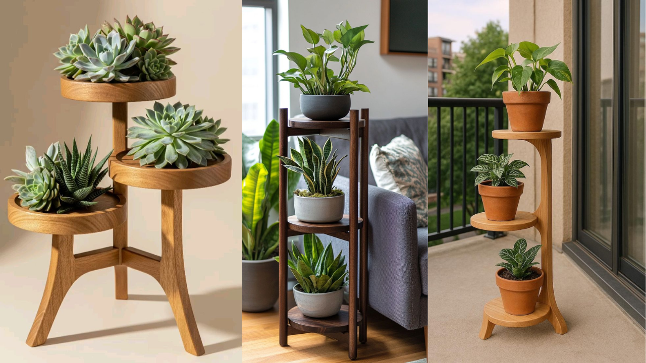फोटो में स्कैंडिनेवियन 3 टायर प्लांट, डार्क अखरोट वर्टकिल स्टैंड के साथ स्लिम कर्व्ड वुडन स्टैंड डिजाइन दिखाए गए हैं। तीन ही सॉलिड सीशम या सागमान की लकड़ी पर बनाए जाते है। आप इसे आउटडोर या फिर ड्राइंग रूम में सोफे के कोने पर या टीवी यूनिट के बगल में रख सकते हैं। ये 1500-3000रु तक मिल जाएंगे।