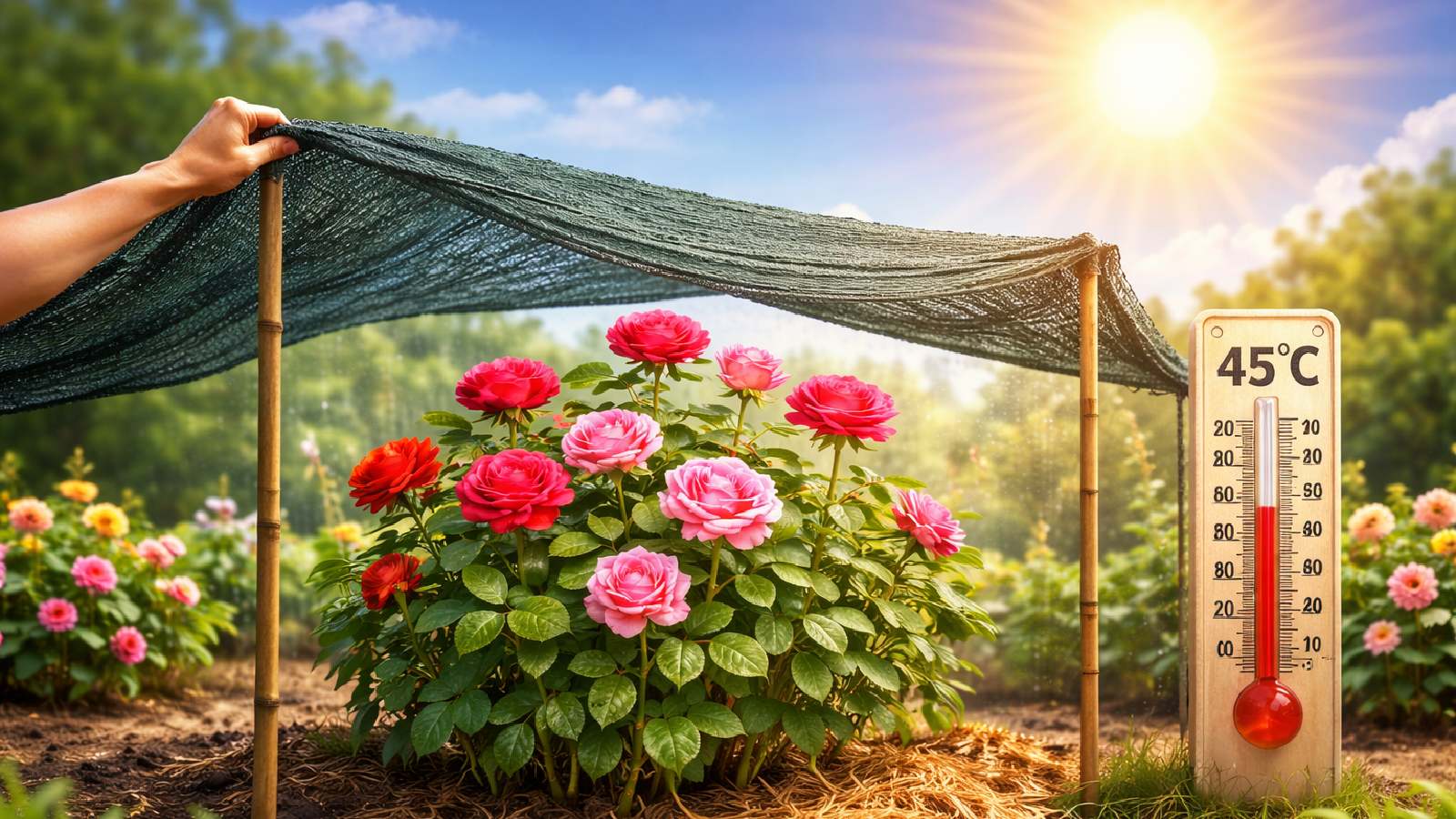 हालांकि गुलाब को धूप पसंद होती है, लेकिन गर्मियों की तेज और सीधी धूप पौधों के लिए नुकसानदायक हो सकती है। अगर दोपहर की धूप बहुत ज्यादा तेज हो, तो पौधों को थोड़ी छाया में रखना सबसे अच्छा होता है। बगीचे में उग रहे पौधों के लिए, आप पौधों को बचाने के लिए शेड नेट या हल्के कपड़े का इस्तेमाल करके छाया बना सकते हैं।