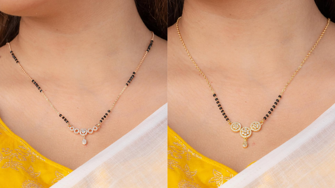 रोजाना पहनने के लिए नग और काले मोती वाले छोटे मंगलसूत्र महिलाओं को खूब पसंद आते हैं। यहां कर्व्ड, ट्रिपल सर्कुलर मोटिफ डिजाइन मंगलसूत्र की दो अलग-अलग डिजाइन दिखाई गई हैं। ये पैटर्न काफी ज्यादा वर्सटाइल होते हैं, जिन्हें हर रोज से शादी-पार्टी के लिए चुना जा सकता है।