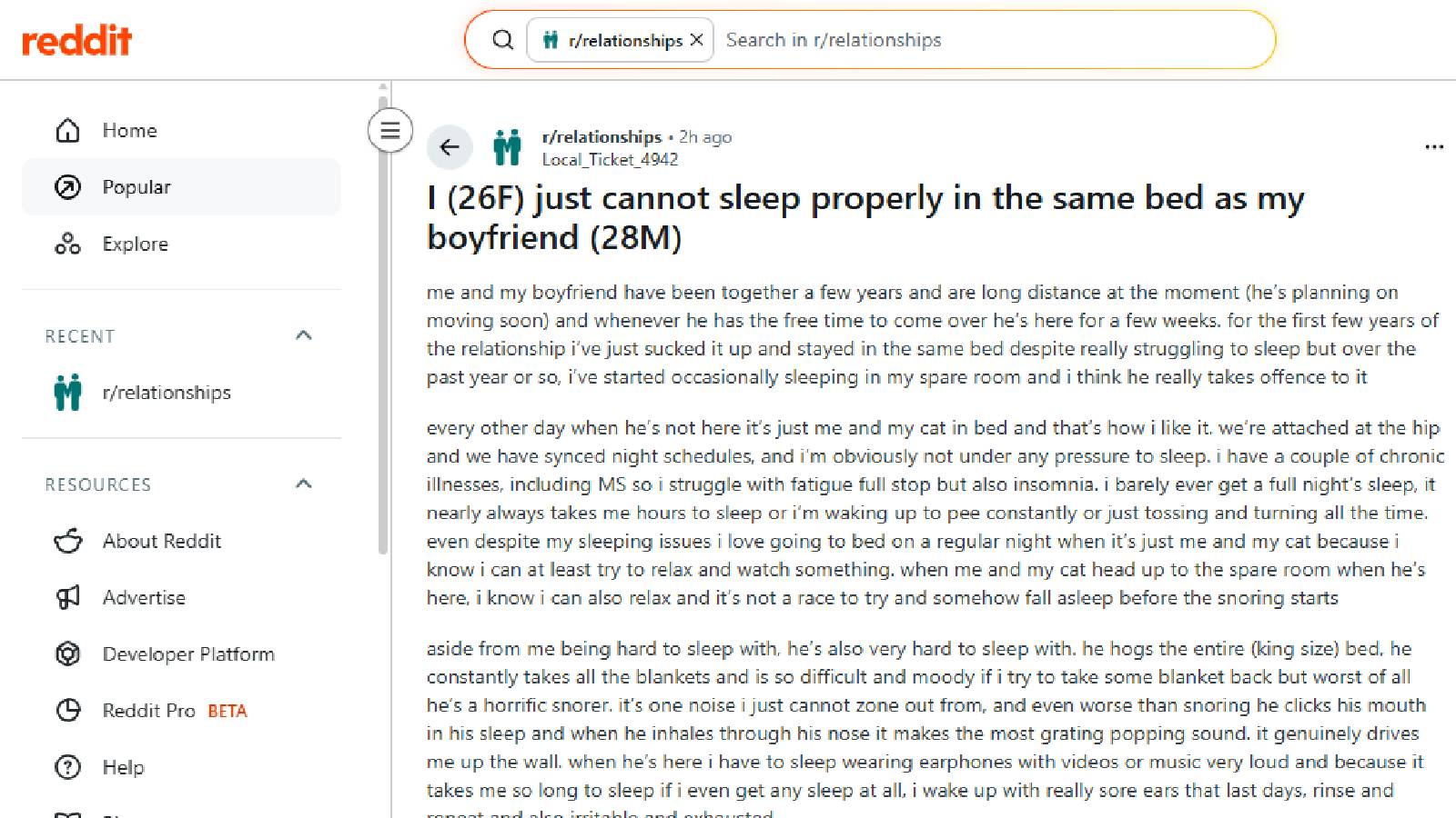 एक लड़की ने रेडिट पर अपनी स्टोरी शेयर की जिस पर लोगों ने अपनी राय देते हुए कहा कि आप दोनों एक साथ बिस्तर पर क्यों नहीं जाते, एक-दूसरे से चिपकते हैं और थोड़ी देर बाद दूसरे कमरे में चले जाते हैं? क्या आपने उससे कहा है कि "मेरी मेडिकल कंडीशन की वजह से मुझे तुम्हारे साथ एक ही बिस्तर पर सोने में दिक्कत होती है, इसलिए हम दोनों को अच्छी नींद आए, इसके लिए मुझे कहीं और सोना होगा"? अगर वह यह नहीं समझता है, तो शायद आपको उसे डेट नहीं करना चाहिए। साथ ही, क्या उसकी स्लीप एपनिया की जांच हुई है या उसने अपने खर्राटों के बारे में डॉक्टर से बात की है? एक अन्य यूजर ने लिखा कि मुझे भी नींद की ऐसी ही दिक्कतें हैं, लेकिन मैं खुशकिस्मत हूं कि मेरी शादी एक ऐसे इंसान से हुई है जिसे बहुत गहरी नींद आती है, इसलिए मुझे अपने करवट बदलने और उसके बगल में सोते समय फ़ोन चलाने के लिए बुरा महसूस नहीं करना पड़ता। बहुत खराब रातों में मैं सोफ़े पर चली जाती हूं या, जब हमारे पास गेस्ट बेड था, तो उस पर चली जाती थी। उसे कभी बुरा नहीं लगा। कभी-कभी अगर कुत्ते उसे जगा देते हैं तो वह खुद सोफे पर चला जाता है।