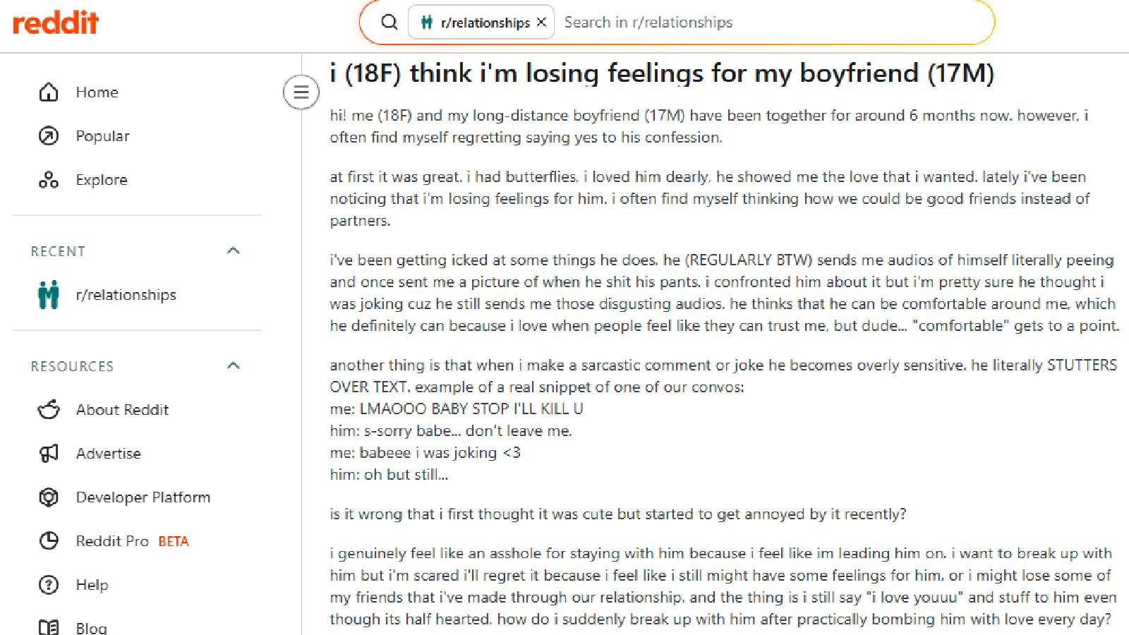 रेडिट पर स्टोरी पढ़ने के बाद कुथ यूजर ने अपनी राय देते हुए कहा कि उनमें से कुछ चीजें बहुत घटिया हैं। इसके बावजूद, आप किसी रिश्ते से नफरत करते हुए भी किसी इंसान से प्यार कर सकते हैं। खासकर रोमांटिक रिश्ते में। उससे ब्रेकअप करने के लिए उससे नफरत करना जरूरी नहीं है। आप साफ तौर पर इस रिश्ते से थक चुके हैं, इसलिए उसे बताने के लिए उसकी इज्तज करें। आपको बस उसके साथ ईमानदार रहना है। दूसरे यूजर ने कबा ईववव WTF यह लड़का बहुत घटिया है - अगर तुम उसके साथ नहीं रहना चाहती तो उसे छोड़ दो, ईव OMG।