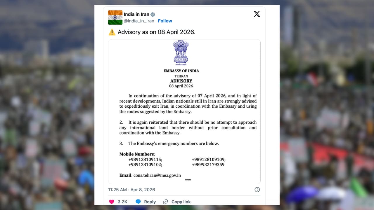 बुधवार, 8 अप्रैल को जारी एडवाइजरी में कहा गया है कि हाल के घटनाक्रम को देखते हुए सभी भारतीय नागरिकों को तेजी से ईरान से बाहर निकलने की सलाह दी जाती है। दूतावास ने यह भी कहा कि किसी भी तरह की यात्रा या सीमा पार करने की कोशिश करने से पहले उनसे संपर्क करना जरूरी है।