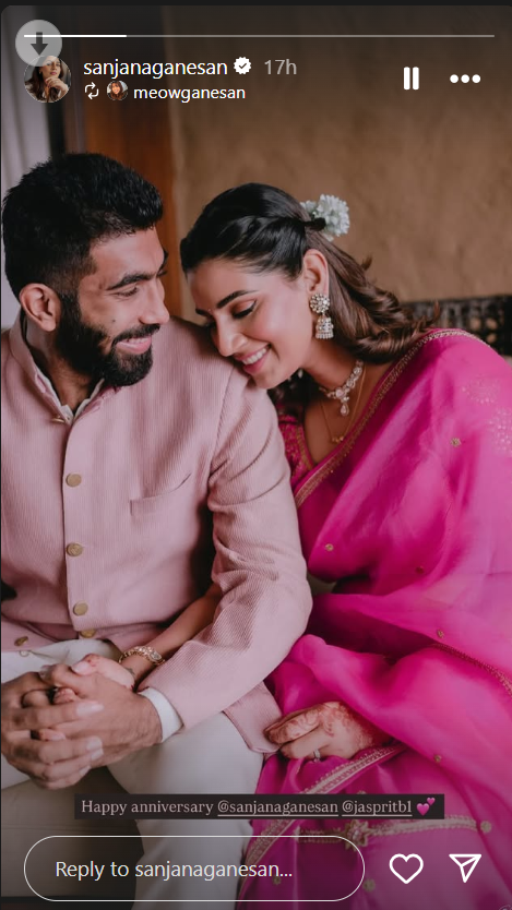 इसके अलावा भी संजना गणेशन ने अपने इंस्टाग्राम अकाउंट पर स्टोरी भी शेयर की है। इस तस्वीर में दोनों एक साथ बैठे हुए नजर आ रहे हैं। उनका अंदाज बेहद ही लाजवाब लग रहा है। साथ ही, उन्होंने खूबसूरत आउटफिट भी पहन रखा है। उन्होंने तस्वीर के ऊपर नोट में लिखा कि "हैप्पी एनिवर्सरी।"