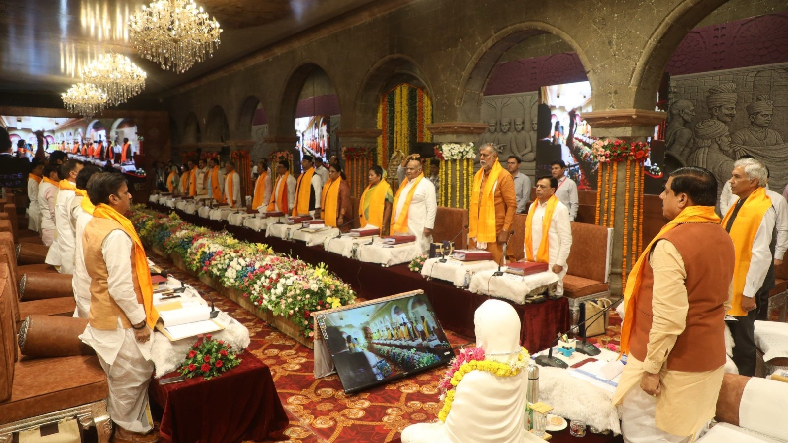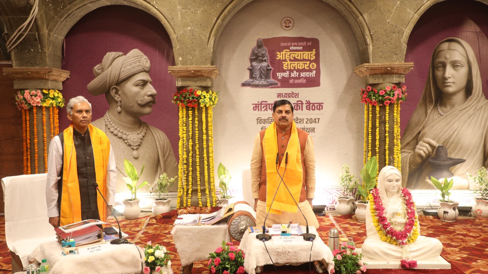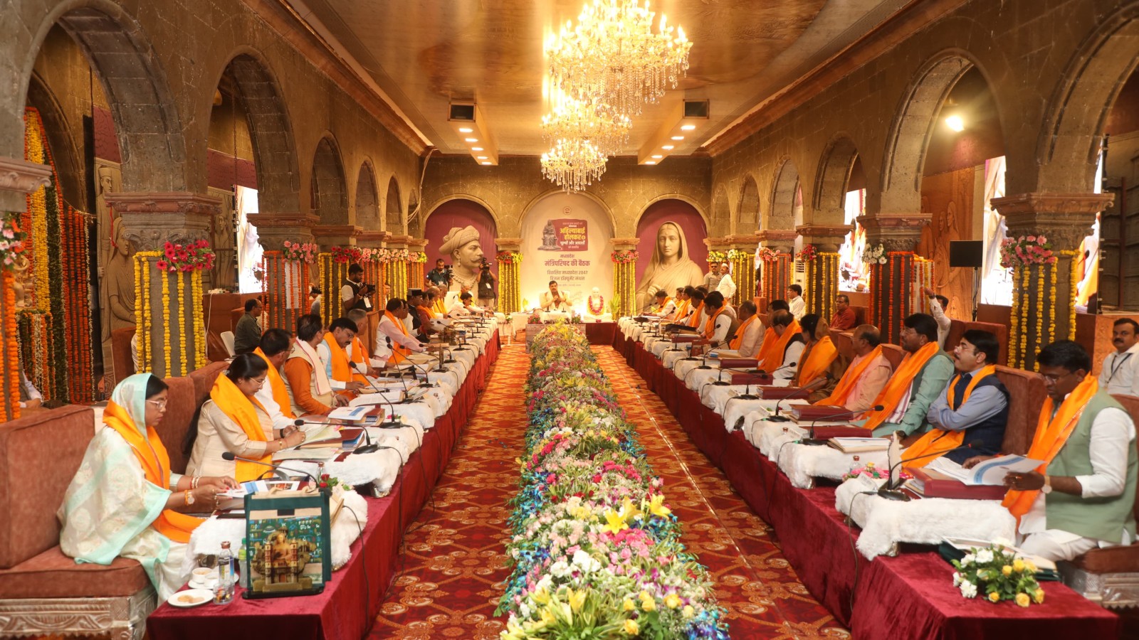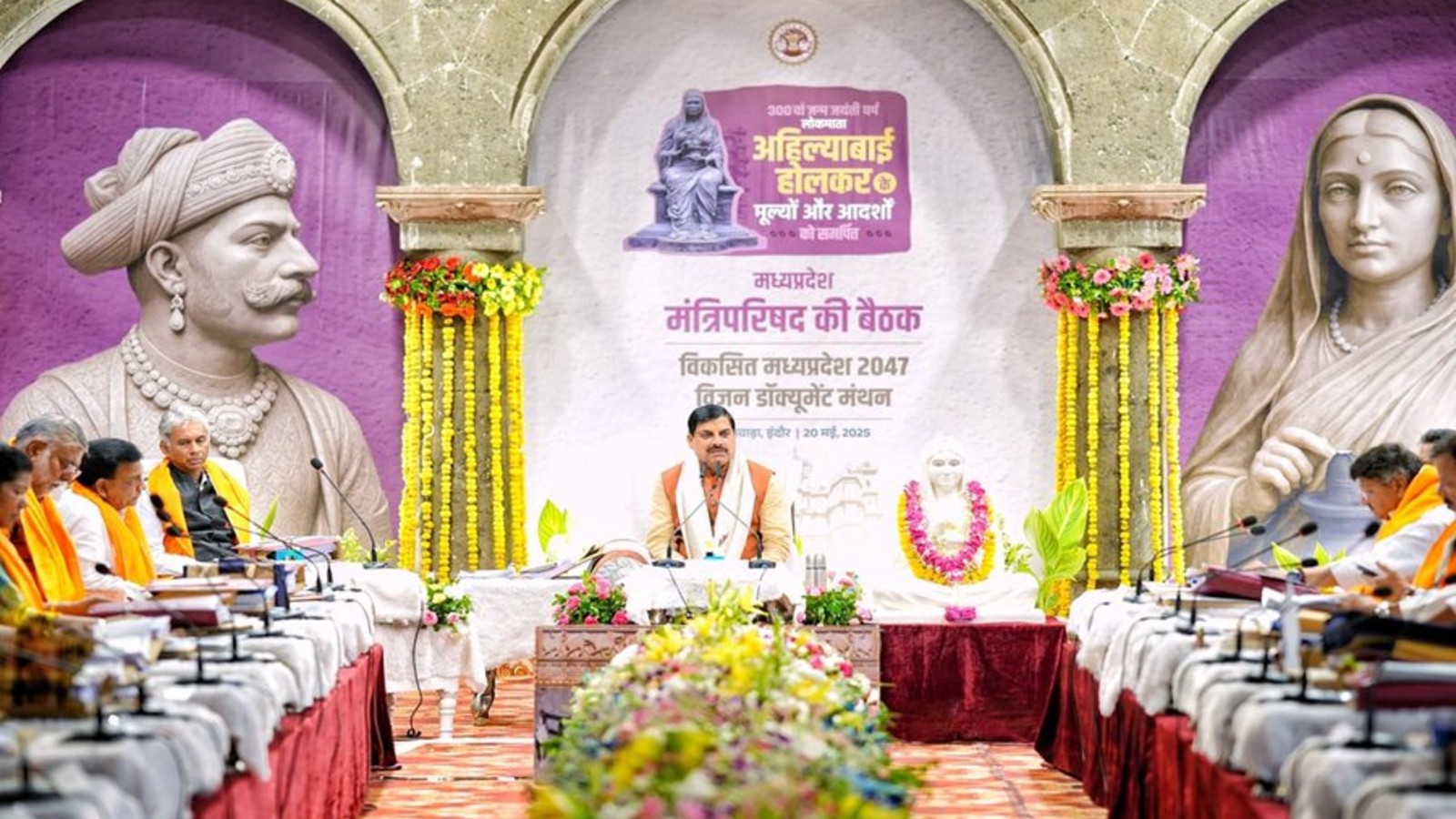 MP Cabinet Meeting: मुख्यमंत्री डॉ. मोहन यादव की अगुवाई में इंदौर के ऐतिहासिक राजवाड़ा गणेश हॉल में हुई कैबिनेट बैठक कई बड़े फैसलों की गवाह बनी। इस दौरान मंत्रियों ने परंपरागत धोती-कुर्ता और भगवा साफा पहनकर देवी अहिल्या को पुष्पांजलि अर्पित की। इस ऐतिहासिक बैठक में घायल को अस्पताल पहुंचाने पर इनाम से लेकर मेट्रो-एयरपोर्ट, महिला सुरक्षा और पर्यटन विकास तक कई अहम घोषणाएं हुईं।