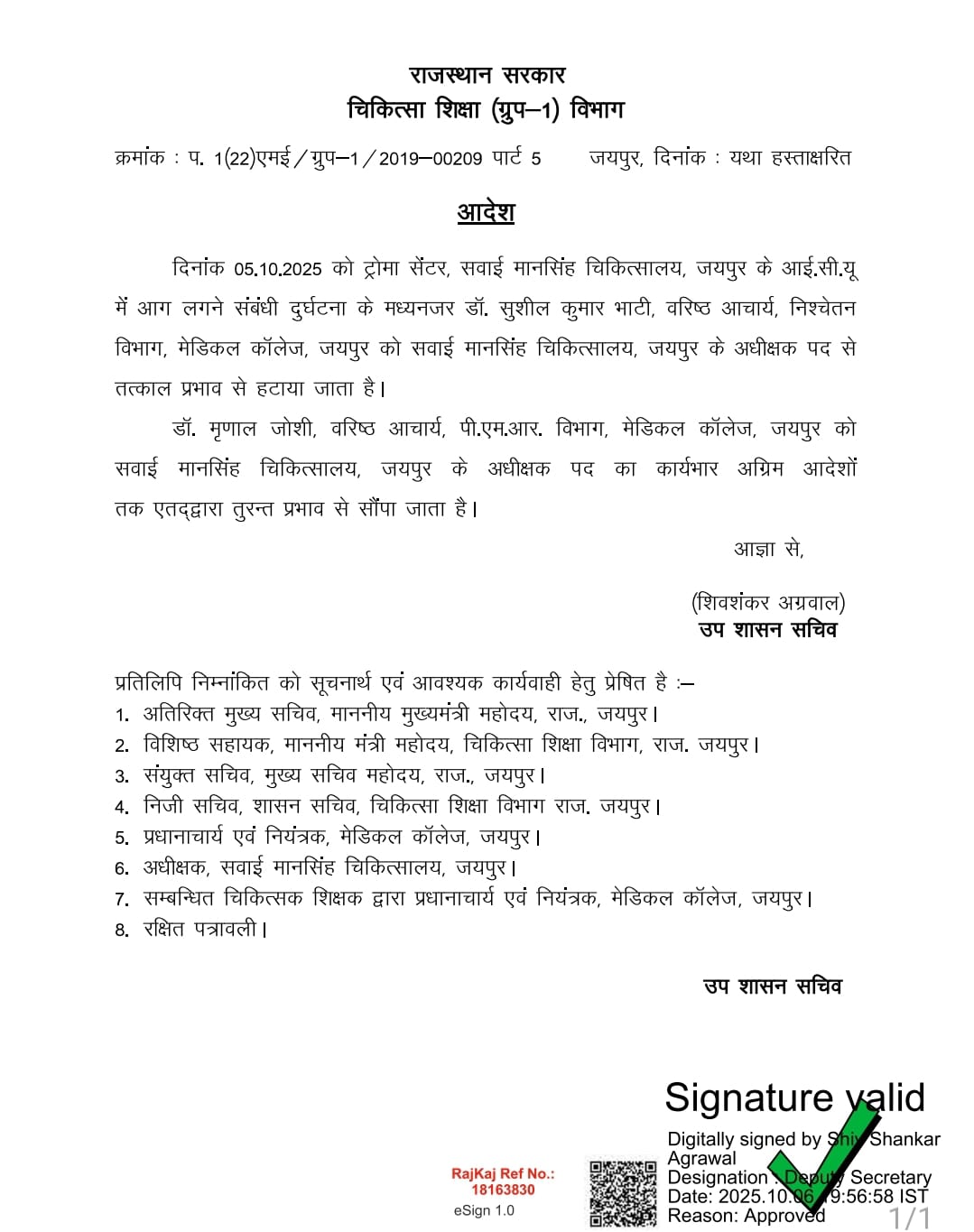 राजस्थान सरकार ने SMS अस्पताल के अधीक्षक डॉ. सुशील भाटी और ट्रॉमा सेंटर के अधीक्षक डॉ. अनुराग धाकड़ को उनके पदों से हटा दिया है। अस्पताल के एग्जीक्यूटिव इंजीनियर मुकेश सिंघल को तत्काल प्रभाव से सस्पेंड कर दिया गया है। इसके अलावा, अस्पताल की फायर सेफ्टी के लिए जिम्मेदार एजेंसी एसके इलेक्ट्रिक कंपनी के खिलाफ FIR दर्ज की गई है और उसका कॉन्ट्रैक्ट भी रद्द कर दिया गया है।