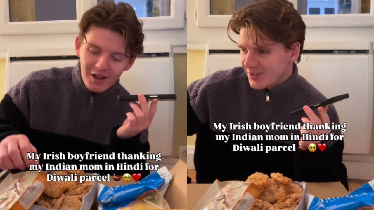 एक वायरल वीडियो में, एक आयरिश लड़का अपनी भारतीय गर्लफ्रेंड की मां को दिवाली गिफ्ट के लिए हिंदी में धन्यवाद दे रहा है। सोशल मीडिया पर उसकी हिंदी में बात करने की कोशिश को खूब सराहा जा रहा है। यह वीडियो लोगों का दिल जीत रहा है।