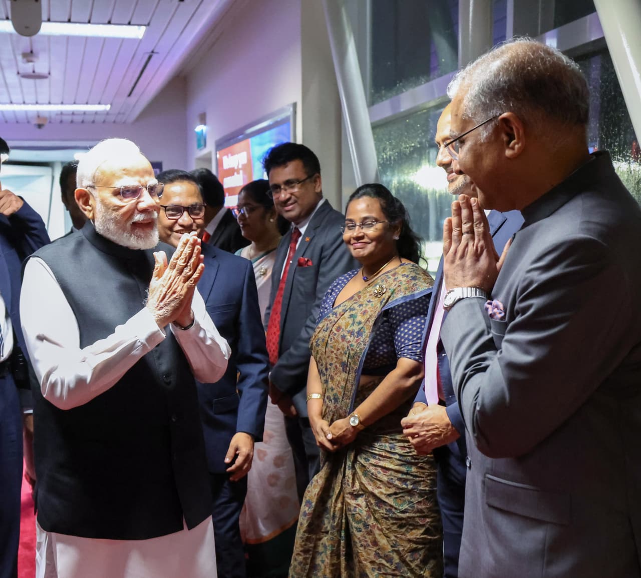 श्रीलंका में बसे भारतीय प्रवासी समुदाय ने पीएम मोदी का गर्मजोशी से स्वागत किया। भारतीय झंडे लहराते हुए लोगों ने प्रधानमंत्री के आगमन पर खुशी जताई।